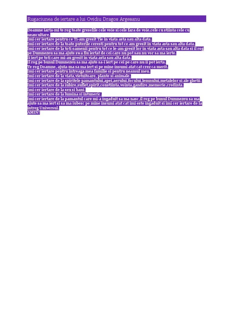 Te rog fierbinte pe tine, tata ceresc, pe tine iisuse hristoase, fiul lui dumnezeu, pe tine sfinte duh, in fata ta, preasfanta treime si a maicii preacurate, imi cer iertare pentru tot ce am gresit fata de intreaga ta creatie divina, cu gandul, cu vorba sau cu fapta, cu stiinta sau fara de stiinta, cu voie sau fara de voie, acum, in trecut sau altadata, impreuna cu.. Imi cer iertare de la iubire, suflet, spirit, constiinta, vointa, gandire, memorie, credinta. Imi cer iertare de la toate puterile ceresti pentru tot ce am. Aceasta rugaciune este facuta de ovidiu dragos argesanu publicat de shanti_dea la 18:17. Dumnezeu, greseala, iertare, iubire, ovidiu dragos argesanu, rugaciune, rugaciune. 19.12.2018 · imi cer iertare de la spiritele pamantului, ale apei, aerului si focului, lemnului si metalelor ale ghetii. 5 martie 2014 la 6:41 pm. Mai mult decat profund, este peste puterea multora de perceptie... Mai mult decat profund, este peste puterea multora de perceptie.